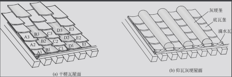 ——都用底瓦,排瓦方式不同“干槎瓦”屋面和“仰瓦灰埂”屋面都是只用底瓦的清制小式屋面。它們不用筒蓋瓦,全部用底瓦相互套搭而成。